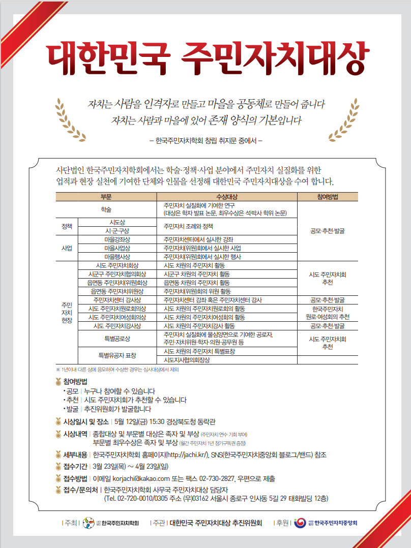 접수기간은 4월 23일까지로 전국 주민자치 가족 여러분의 적극적인 동참과 많은 관심 부탁드립니다.