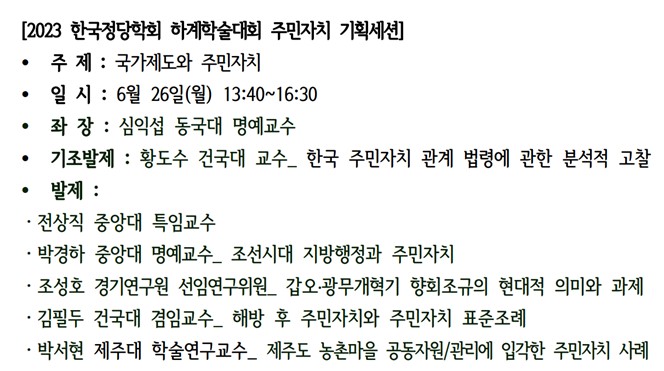 2023년 한국정당학회 하계학술대회에서 주민자치 기획세션이 열립니다!