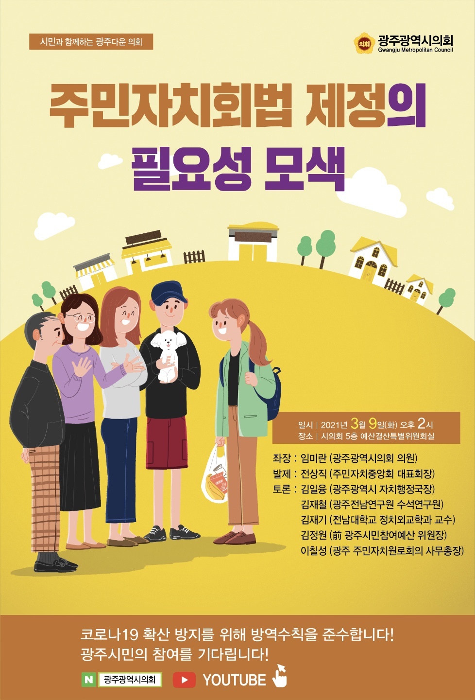 3월 9일 화요일 광주광역시의회 5층 예산결산 특별위원회실에서 주민자치회법 제정의 필요성 모색을 주제로 한 토론회가 개최됩니다.