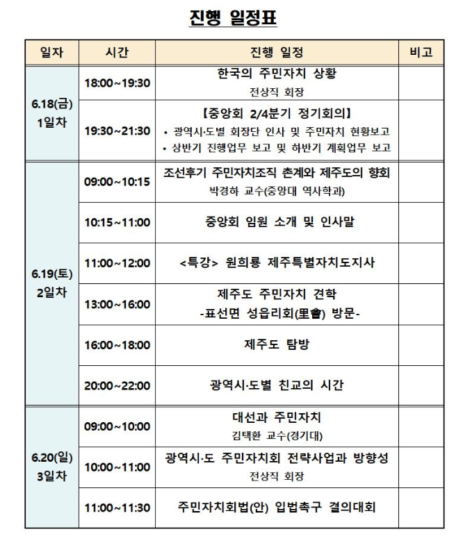 특히 이번 행사에는 박경하 중앙대 교수의 '조선후기 주민자치조직 촌계와 제주도의 향회', 원희룡 제주특별자치도지사의 특강, 제주도 표선면 성읍리회(里會) 방문, 김택환 경기도 교수의 '대선과 주민자치', 전상직 중앙회 대표회장의 ‘한국의 주민자치 상황’, ‘광역시도 주민자치회 전략사업과 방향성’ 등 주민자치 실현을 위한 지향점과 현장 활동에서 큰 도움이 될 강연과 프로그램 등이 마련되어 있습니다.