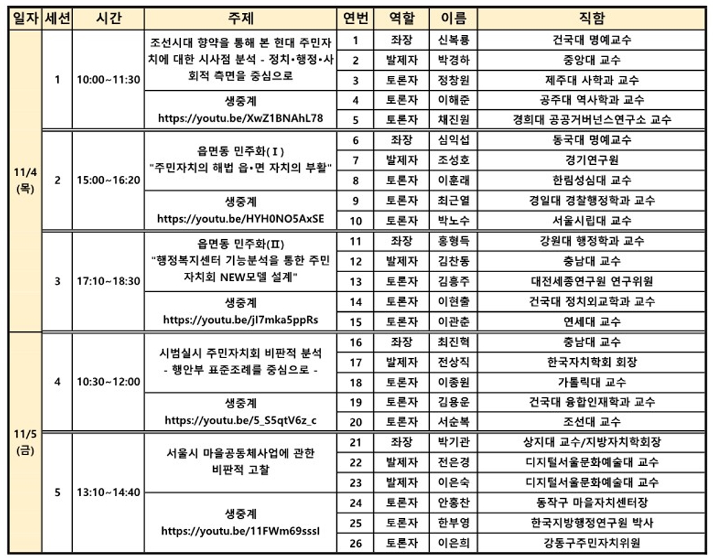 한국주민자치중앙회 기획세션의 모든 일정은 유튜브를 통해 생중계되며, 각 섹션별 주제를 비롯한 좌장, 발제자, 토론자 정보와 유튜브 생중계 주소는 아래를 참조하면 된다.